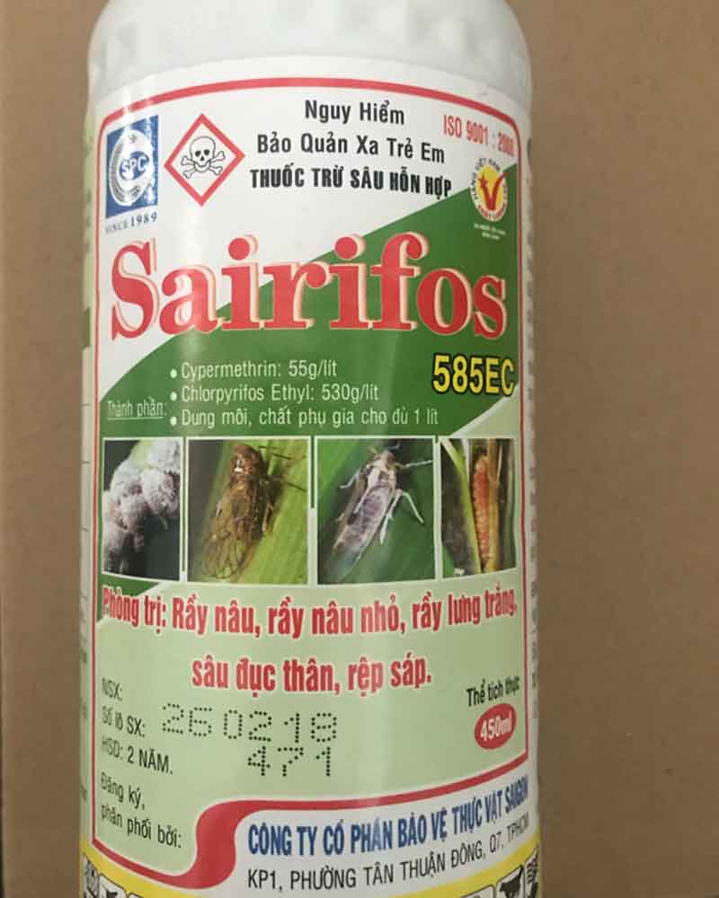 Sairifos 585EC có khả năng diệt sâu, tiêu độc, xua đuổi và xông hơi nên có thể tiêu diệt sâu bệnh nhanh và mạnh nhất. Loại thuốc này chuyên dùng để đặc trị rầy nâu, sâu đục bẹ hại lúa, bọ trĩ hại xoài, rệp sáp hại cà phê.