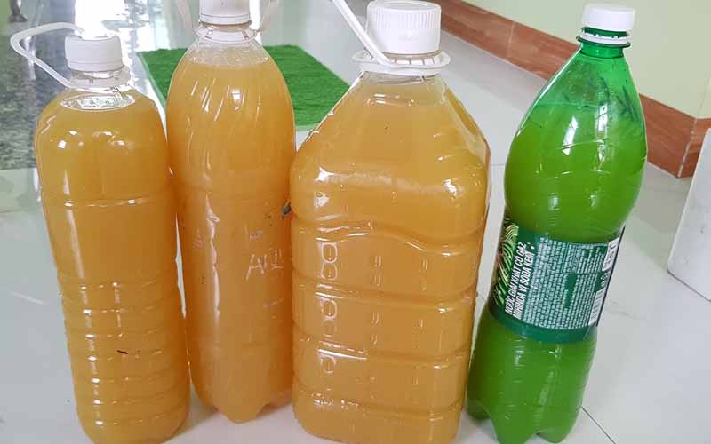 - Bước 1: Cho mía nguyên chất và nước sạch vào bình chứa và khuấy đều lên. Lưu ý, nếu bà con dùng đường thay cho nước mía thì nên khuấy cho đến khi đường tan hết.