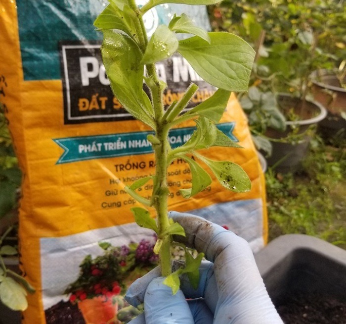 - Bước 3: Đổ đất vào trong chậu rồi cho cành vào trong đất, ấn nhẹ xuống và lấp đất lên