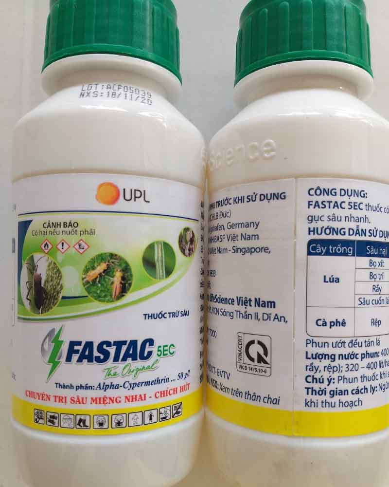 Thuốc trừ sâu Fastac 5EC là thuốc trừ sâu thuộc nhóm Pyrethroid, tác dụng tiếp xúc, vị độc, phổ tác dụng rộng, thuốc được đăng ký diệt rầy, bọ xít, bọ trĩ (sâu đục thân cà phê) hại lúa, rầy nâu hại cà phê.